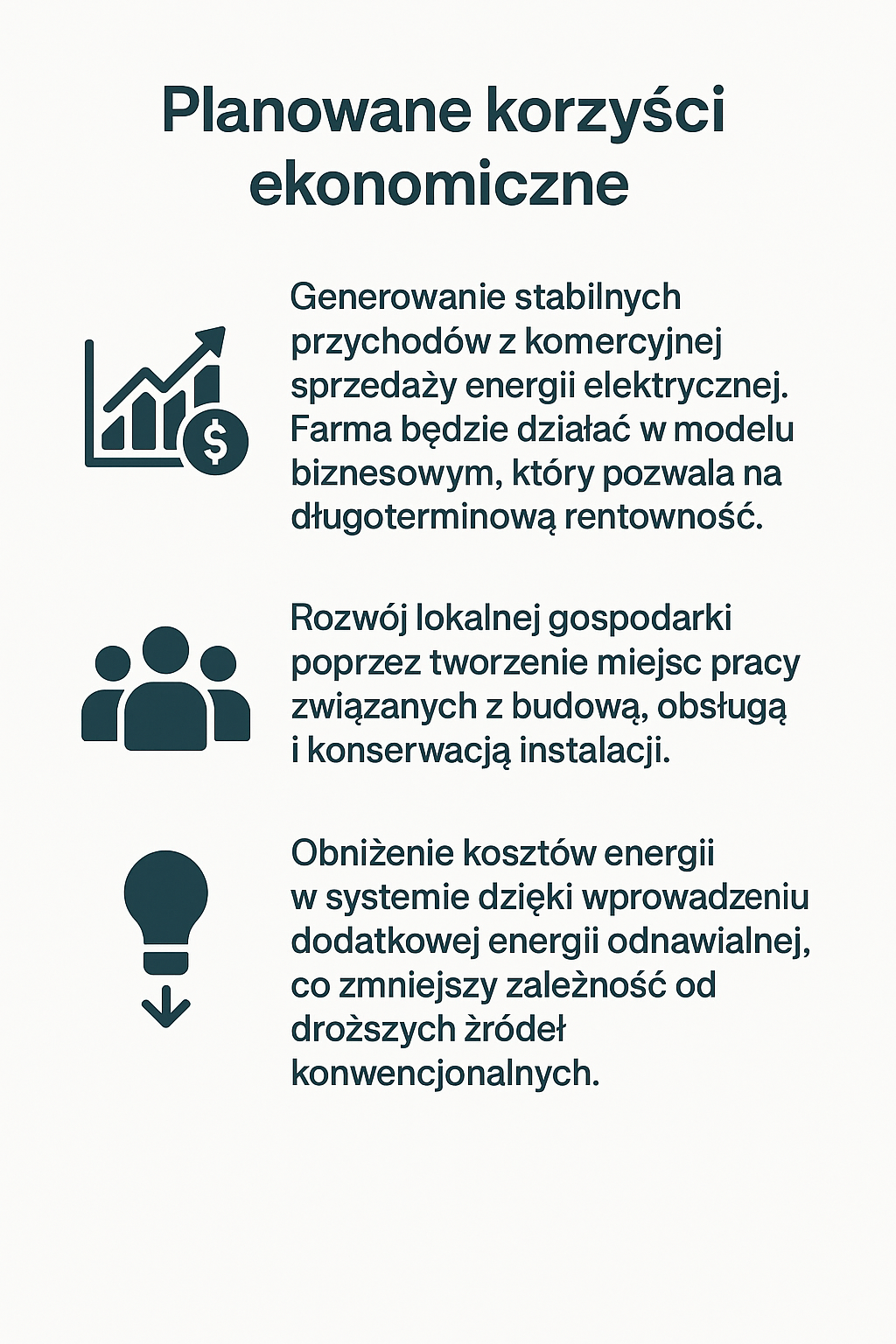 -Wspieranie lokalnej gospodarki przez stworzenie miejsc pracy przy budowie farmy oraz w jej późniejszej obsłudze technicznej i zarządzaniu.