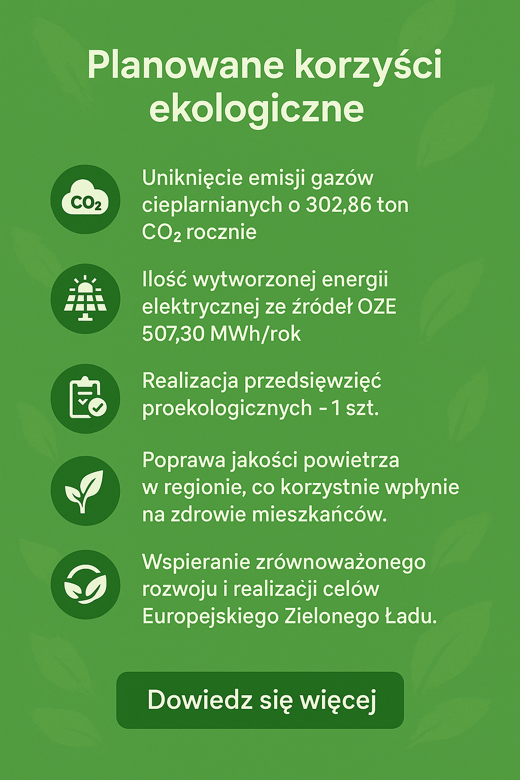 -Produkcja i sprzedaż energii elektrycznej wytwarzanej w 100% ze źródeł odnawialnych, co pozwoli na osiągnięcie rocznej produkcji energii elektrycznej z OZE na poziomie 507,3 MWh.